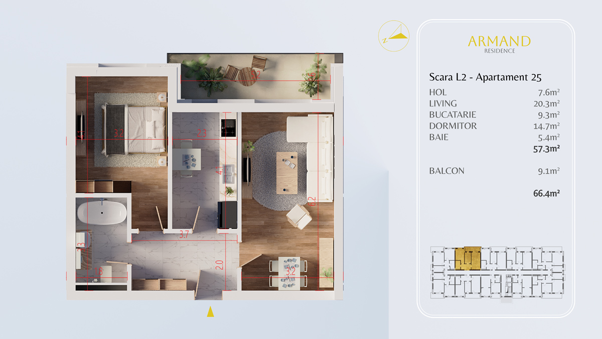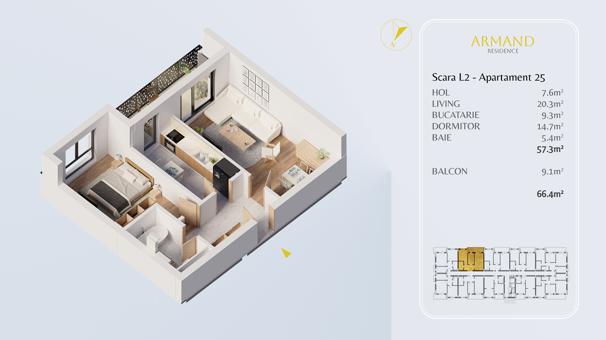 Apartament nr. 25 – Etaj 2 – Bloc 2 – 2 camere - Armand Residence