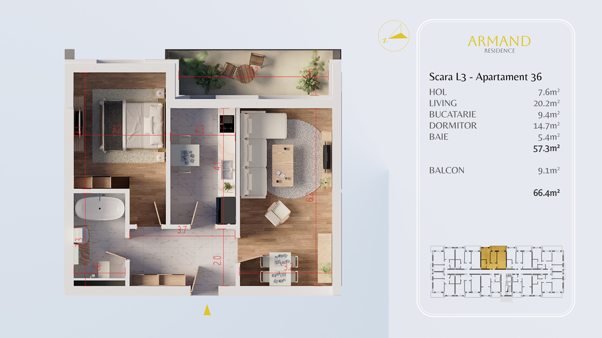 Apartament nr. 36 – Etaj 3 – Bloc 3 – 2 camere - Armand Residence