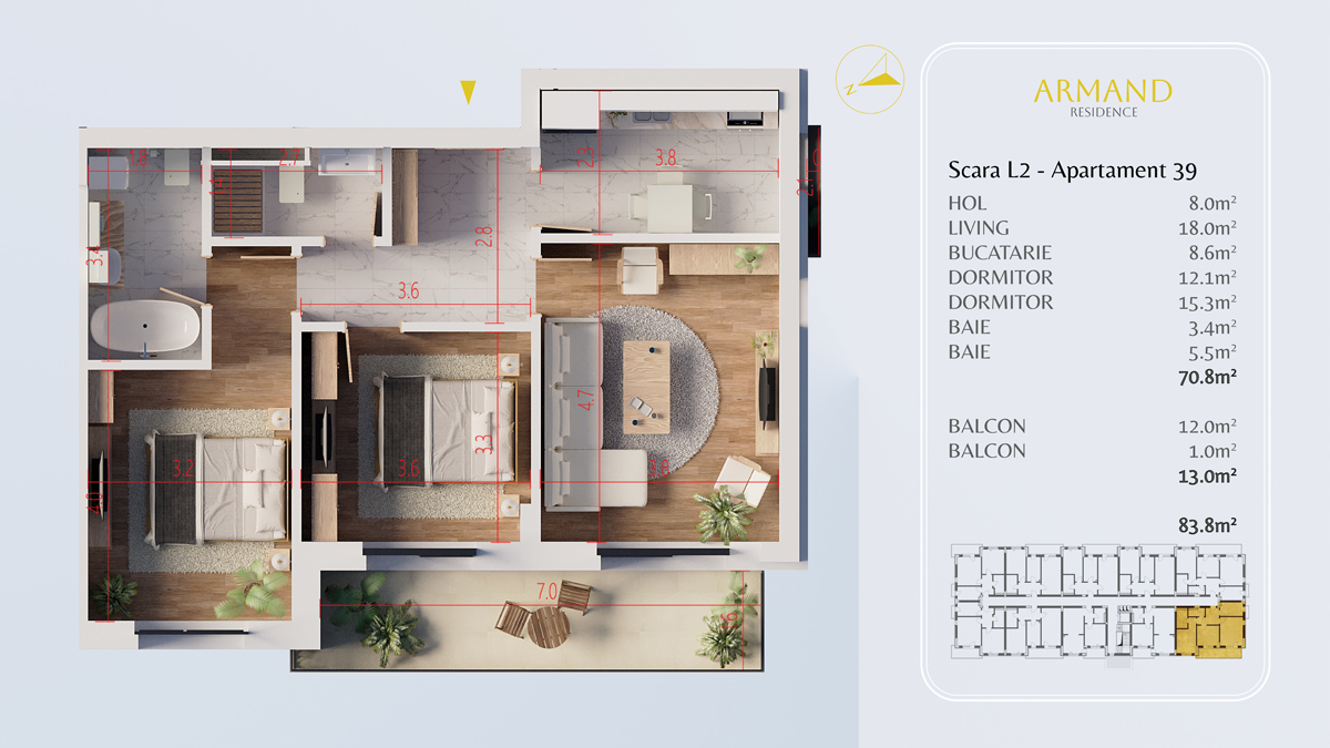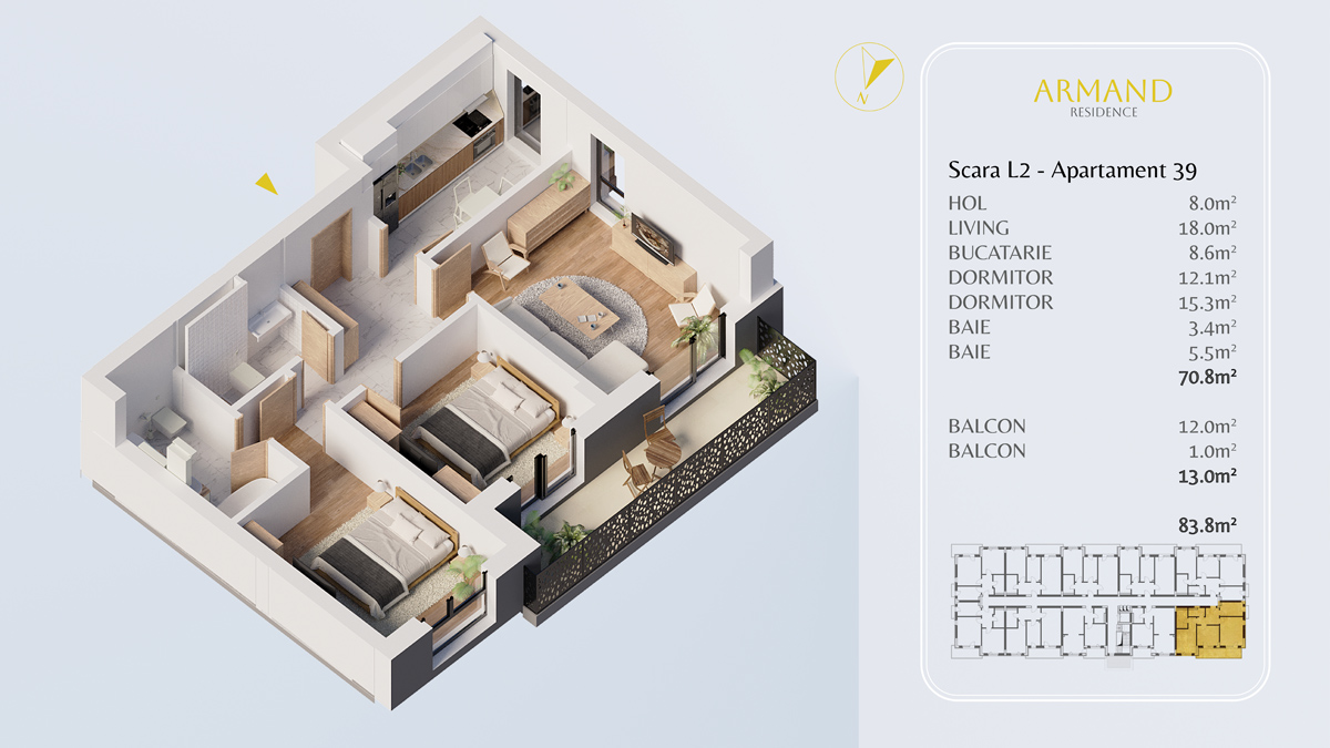 Apartament nr. 39 - Etaj 3 - Bloc 2 - 3 camere - Armand Residence